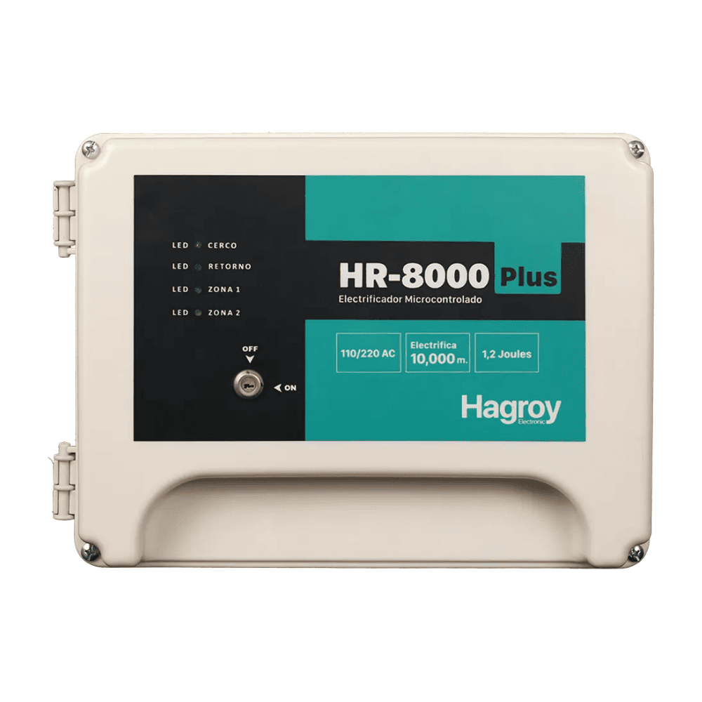 El energizador Hagroy HR8000 Plus está diseñado para sistemas de cerco eléctrico de alta seguridad, combinando gran potencia de salida con funciones inteligentes de detección, respaldo y monitoreo. Entrega una energía de hasta 1,2 joules RMS y una tensión regulable de 12 kV a 15 kV, cubriendo hasta 10.000 metros de cerco. Ideal para industrias, perímetros agrícolas y condominios de gran tamaño, asegurando máxima protección y autonomía ante cortes eléctricos. :contentReference[oaicite:0]{index=0}